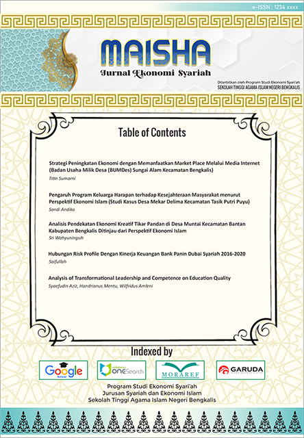 Journal title MAISHA: Jurnal Ekonomi Syariah Initials MAISHA. Frequency 2 issues per year Editor-in-chief Al Ma'rif, IAIN Datuk Laksemana Bengkalis Publisher Prodi Ekonomi Syari'ah https://ejournal.kampusmelayu.ac.id/index.php/index